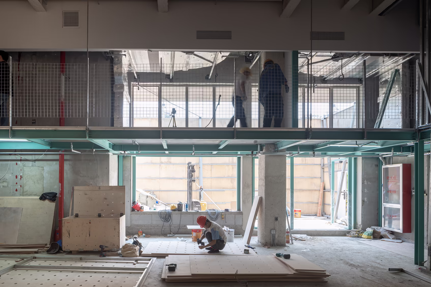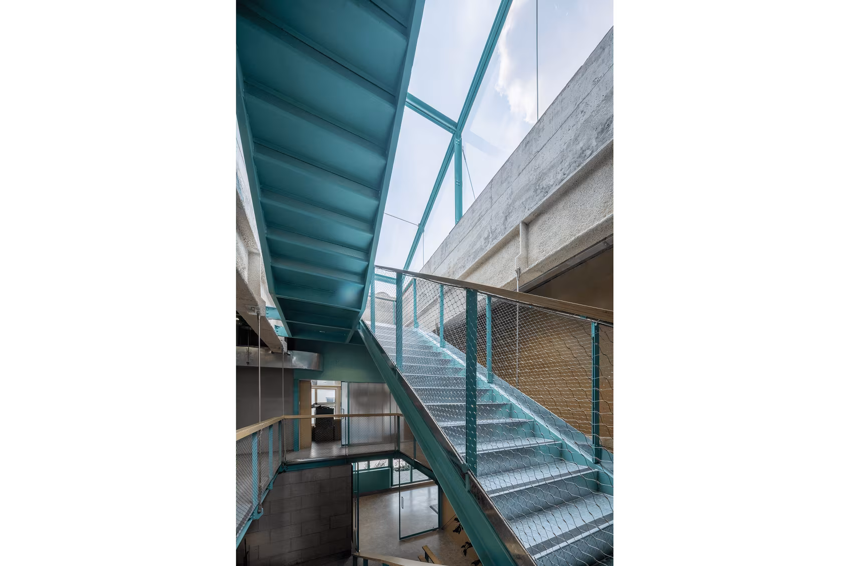 Within an existing space located on 3rd and 4th floor of Columbia Circle, building 10#, we added a new mezzanine structure which transformed the space into a creative environment. A new featured staircase has been designed as the central piece of the project, it connects the 3rd floor, 4th floor and opens to the rooftop on 5th floor with a glass box.