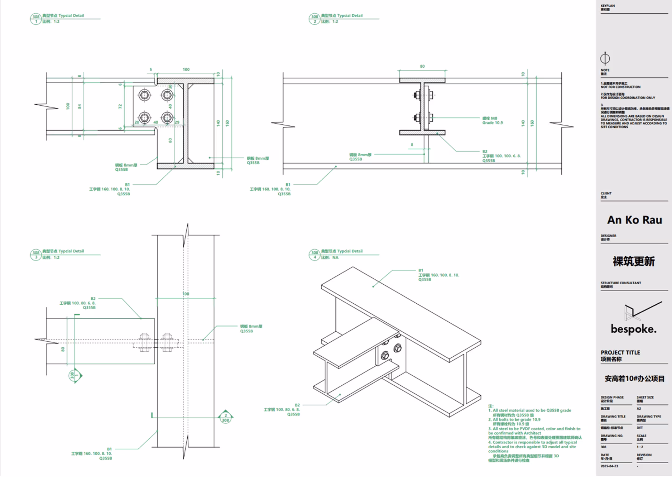 Ankorau LABO Center project presents a collection of structure details that are the key aspect of the project. Through our model and drawing package organization, a complete workflow has been setup using all the power of Rhino to implement a full 3D model at fabrication level, with associated 2D drawings at minimu efforts, both in Rhino and AutoCAD.