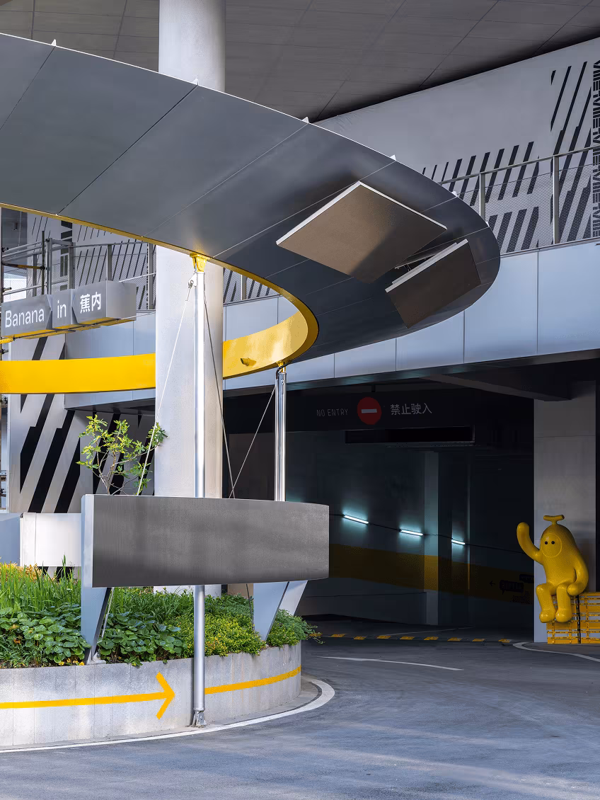 bespoke. has once again collaborated with RoarcRenew to create an inspiring and innovative space in West Bund, redefining the entrance of Bananain’s brand space — The circular driveway has been transformed into a covered public station structure, the LED screen structure wraps around the entire building, and a series of cables has been pulled between the main columns to suspend Bananain’s branded signage boxes.