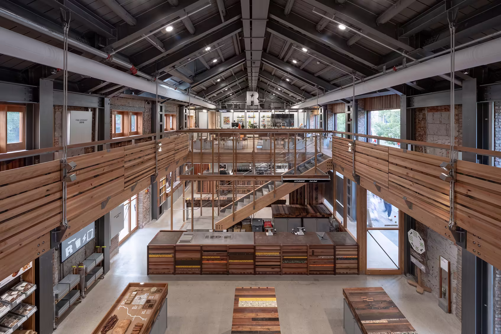 The entire second floor is a newly added Suspended platform, which is also the most challenging part of this building renovation. Unlike traditional support, it features a hanging structure achieved through the tension of tie rods, giving the space a fascinating sense of floating. This design element resonates with the recycled materials from old ships, adding a unique, dynamic quality to the space.